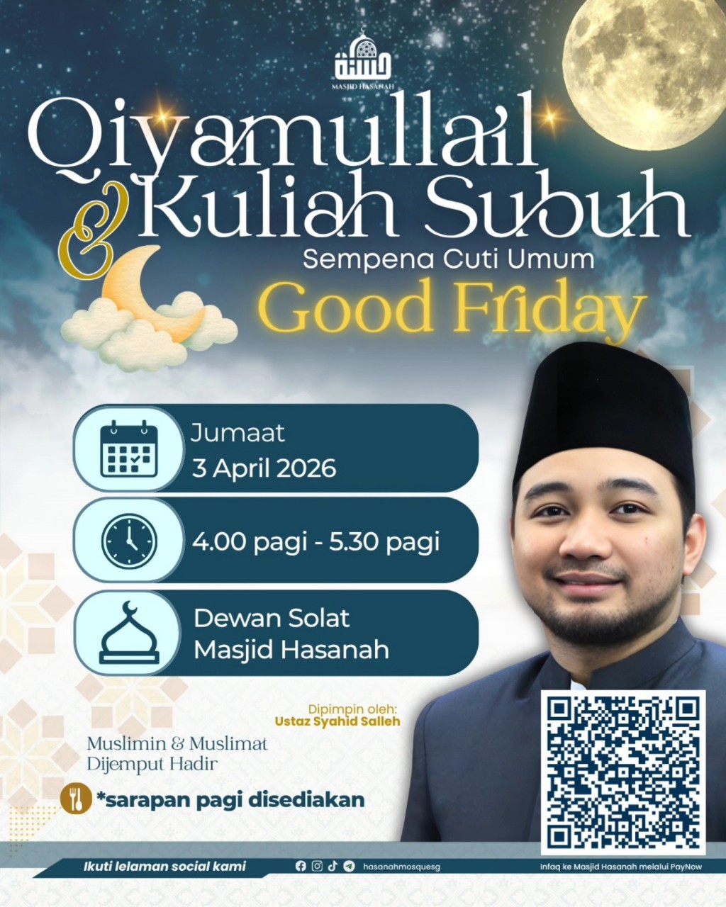 03 Apr, 2026 From 4:00 AM to 5:30 AM Dewan Solat Utama, Masjid Hasanah, Singapore View MapEvent will be conducted in Malay